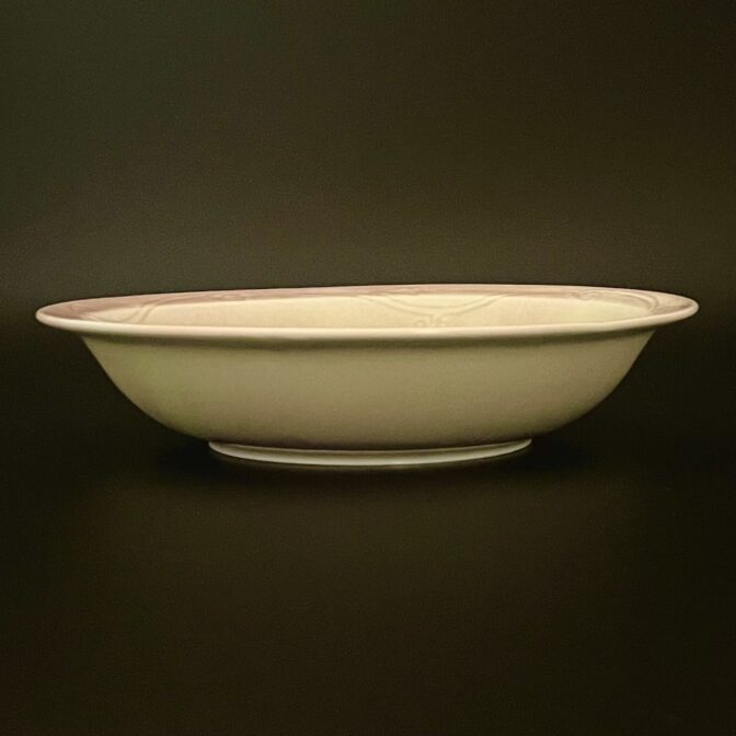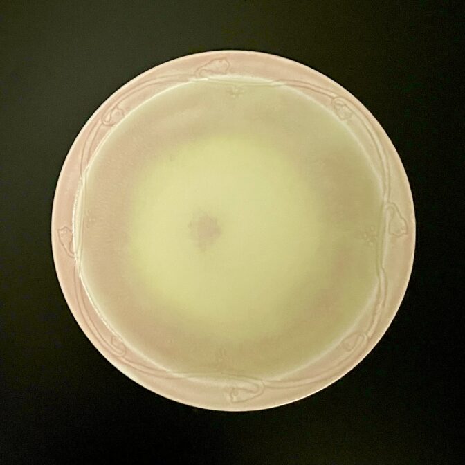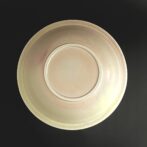 少し深めのお皿です。360cc位入ります。フチにはすずらんの彫りが施してあります。器の表面にかけられた釉薬は 色合いを表現しました。少し艶をおさえたマット調の黄色味の強い黄緑色で、しっとりとした手触りです。黄色が持つ力として、空間を明るくさせる効果や、集中力や判断力、記憶力を高める効果があると言われています。