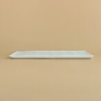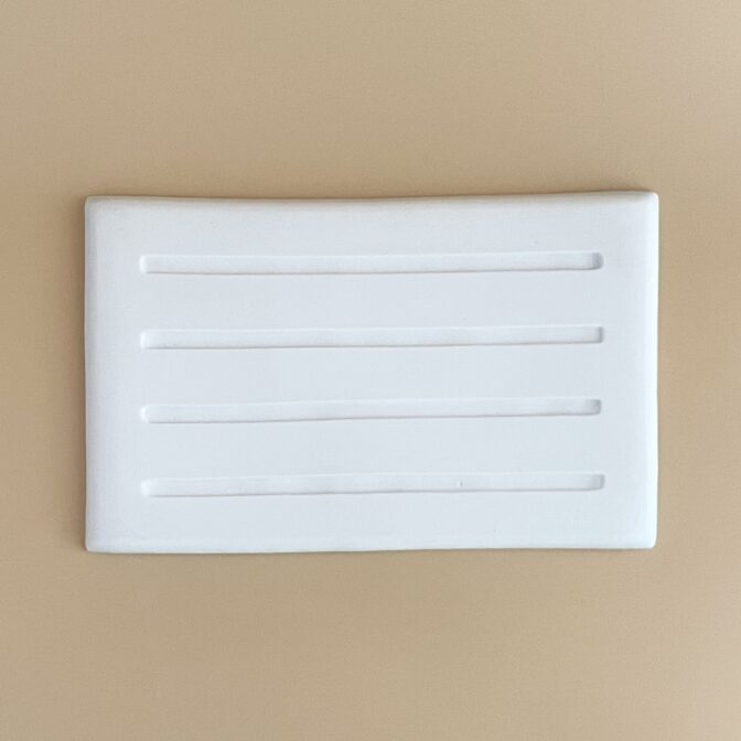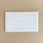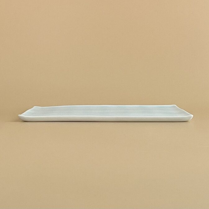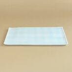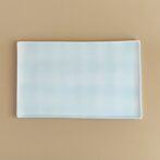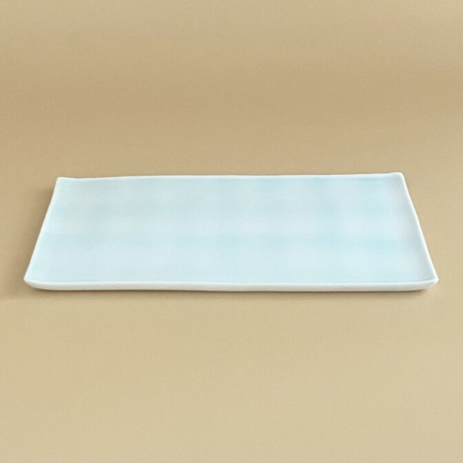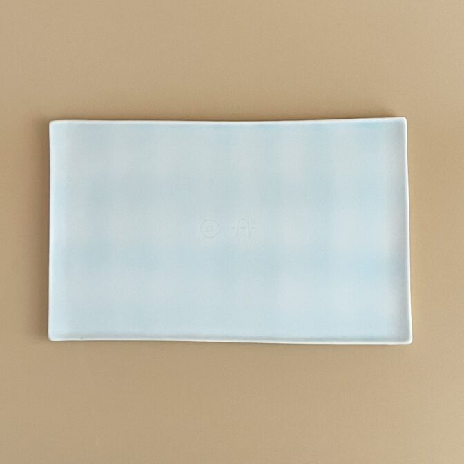 フラットでシンプルな角皿です。表面は淡い水色のチェック模様が施してあります。料理やデザートはもちろん、インテリアとしてキャンドルを置いたりと様々な使い方をお楽しみください。高台がない分、安定感もあり重ねて収納もおすすめのポイントです。中央には日本の古代文字(読み方:アジ)の模様が施してあります。これはお魚の鯵が一枚のる大きさのお皿と言うことで「アジ」としました。器の表面にかけられた釉薬は白浜の透き通る浅瀬のような清々しい色合いを表現しました。少し艶をおさえたマット調の淡い水色で、しっとりとした手触りです。水色の持つ力として、開放感や安心感を与えてくれる効果があると言われています。