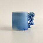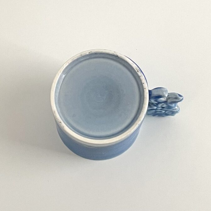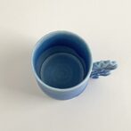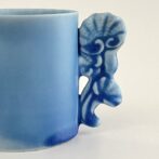 今回ご用意しましたのは、レギュラーカップとデミタスカップの中間の大きさで、容量が100~120cc前後のコーヒーカップです。品よく飲みたい方やたっぷりはいらないけど、デミダスカップほど少量ではもの足りないという方にぴったりです。取っ手は万年茸(マンネンタケ)をイメージした模様が施してあります。器の表面にかけられた釉薬は一面にどこまでも続く青く透き通る海ような、穏やかな色合いを表現しました。少し艶をおさえたマット調の深い青色で、しっとりとした手触りです。青が持つ力として、気持ちを落ち着かせ集中力を高める効果や、食欲を抑制させる効果があると言われています。
