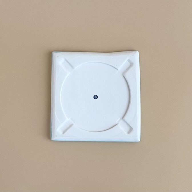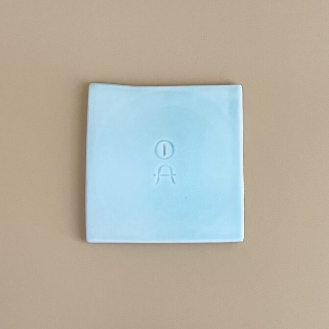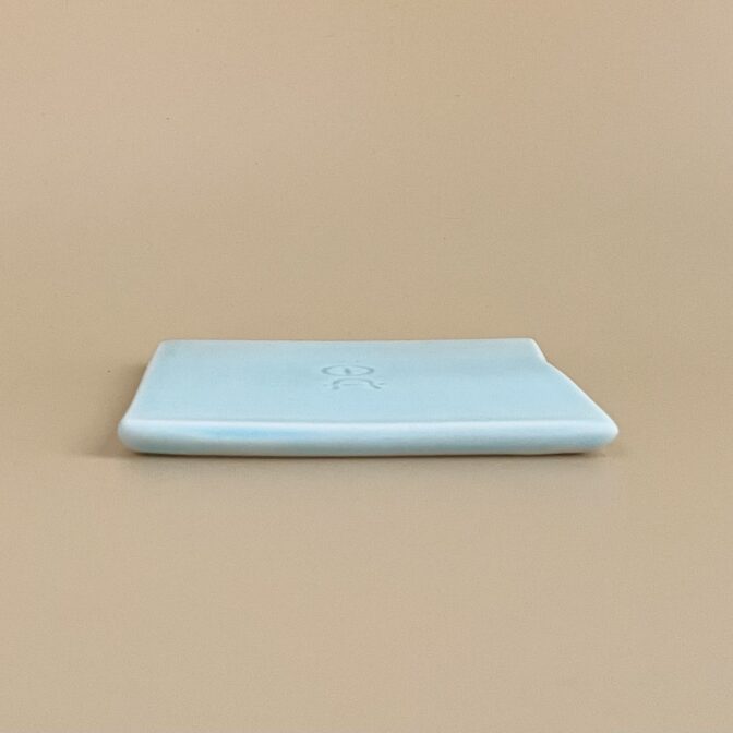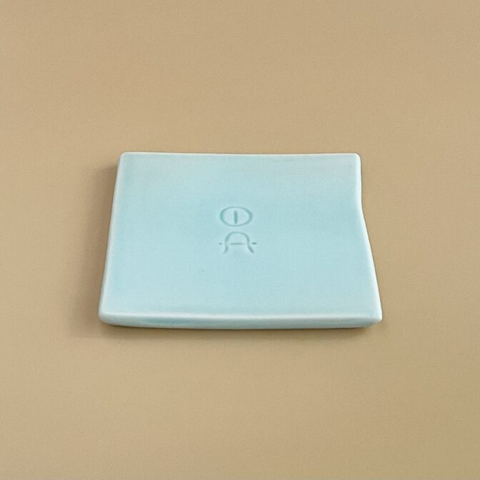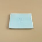 主菓子や干菓子などと相性の良い、角のフラット皿です。洋菓子でしたらフィナンシェや小ぶりのクッキーなどのお菓子でしたらぴったりです。高台がない分、安定感もあり重ねて収納もおすすめのポイントです。中央には日本の古代文字(読み方:カシ)の模様が施してあります。これはお菓子を楽しむお皿と言うことで「カシ」としました。器の表面にかけられた釉薬は白浜の透き通る浅瀬のような清々しい色合いを表現しました。少し艶をおさえたマット調の淡い水色で、しっとりとした手触りです。水色の持つ力として、開放感や安心感を与えてくれる効果があると言われています。